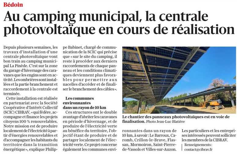 Vaucluse matin fait le point sur l’avancée des travaux de la centrale photovoltaïque réalisée par CIBRAV sur l’aire des caravanes du camping municipal de Bédoin