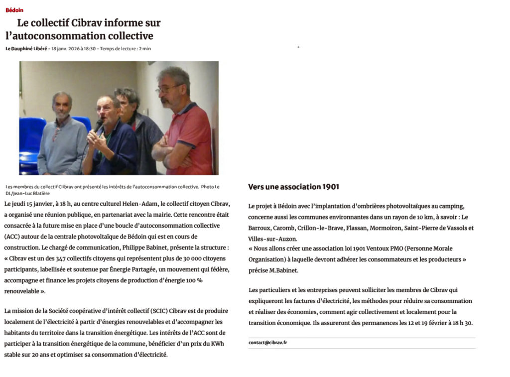 Vaucluse matin publie le compte-rendu de la réunion publique du 15 janvier organisée par CIBRAV et la mairie de Bédoin, sur l’autoconsommation collective future pour Bédoin et ses environs.